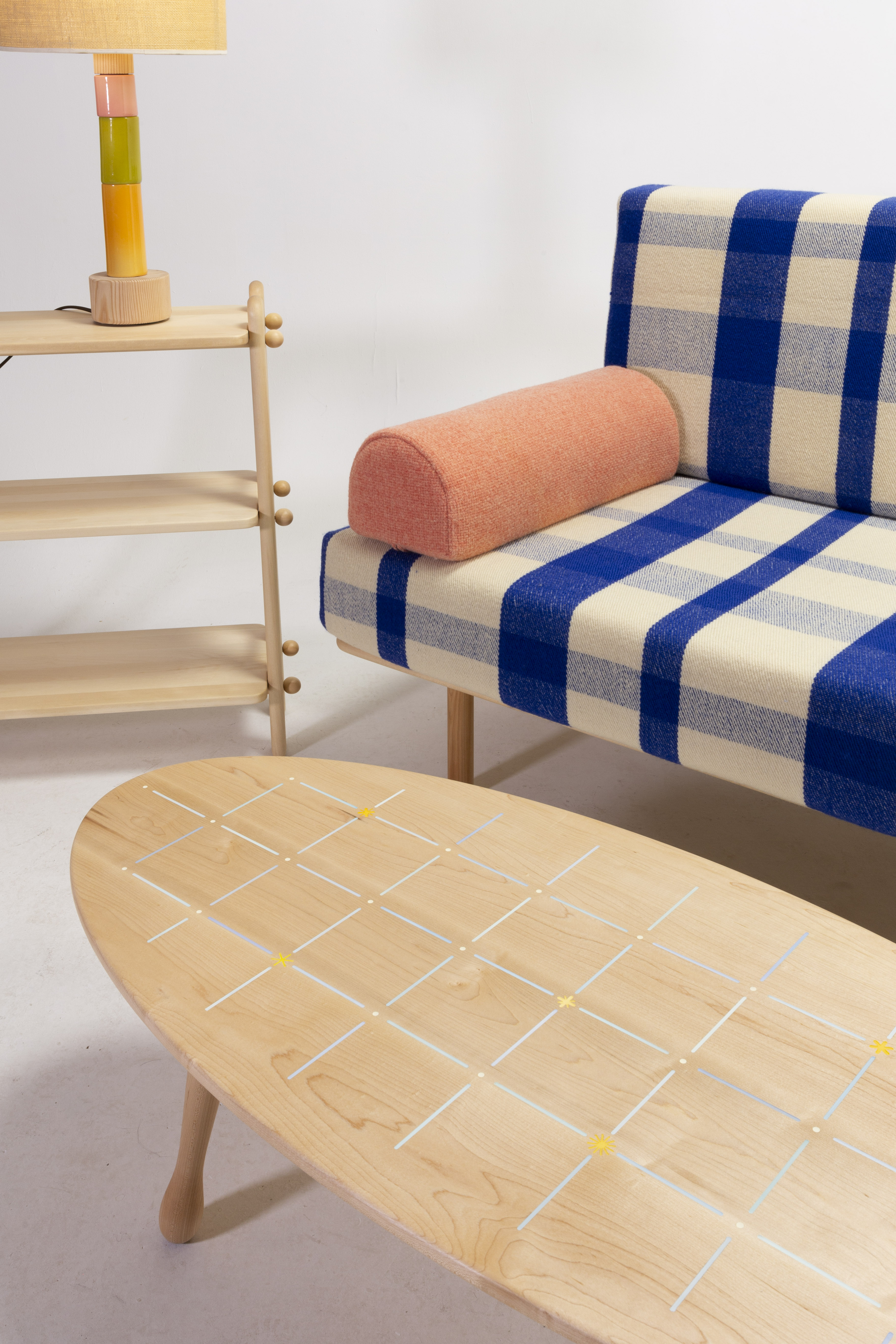 FLOOR AND TABLE LAMPS: SLIP-CAST CERAMIC “BEADS”, ASH, DOUGLAS FUR, FABRIC, STEEL, ELECTRICAL. • KNOB SHELF: BIRCH, HARDWARE. • GAZING COFFEE TABLE: MAPLE, PAINT, EPOXY. • LITTLE HOUSE RUG: WOOL, SYNTHETIC YARN, MONKS CLOTH, FLEX SEAL.