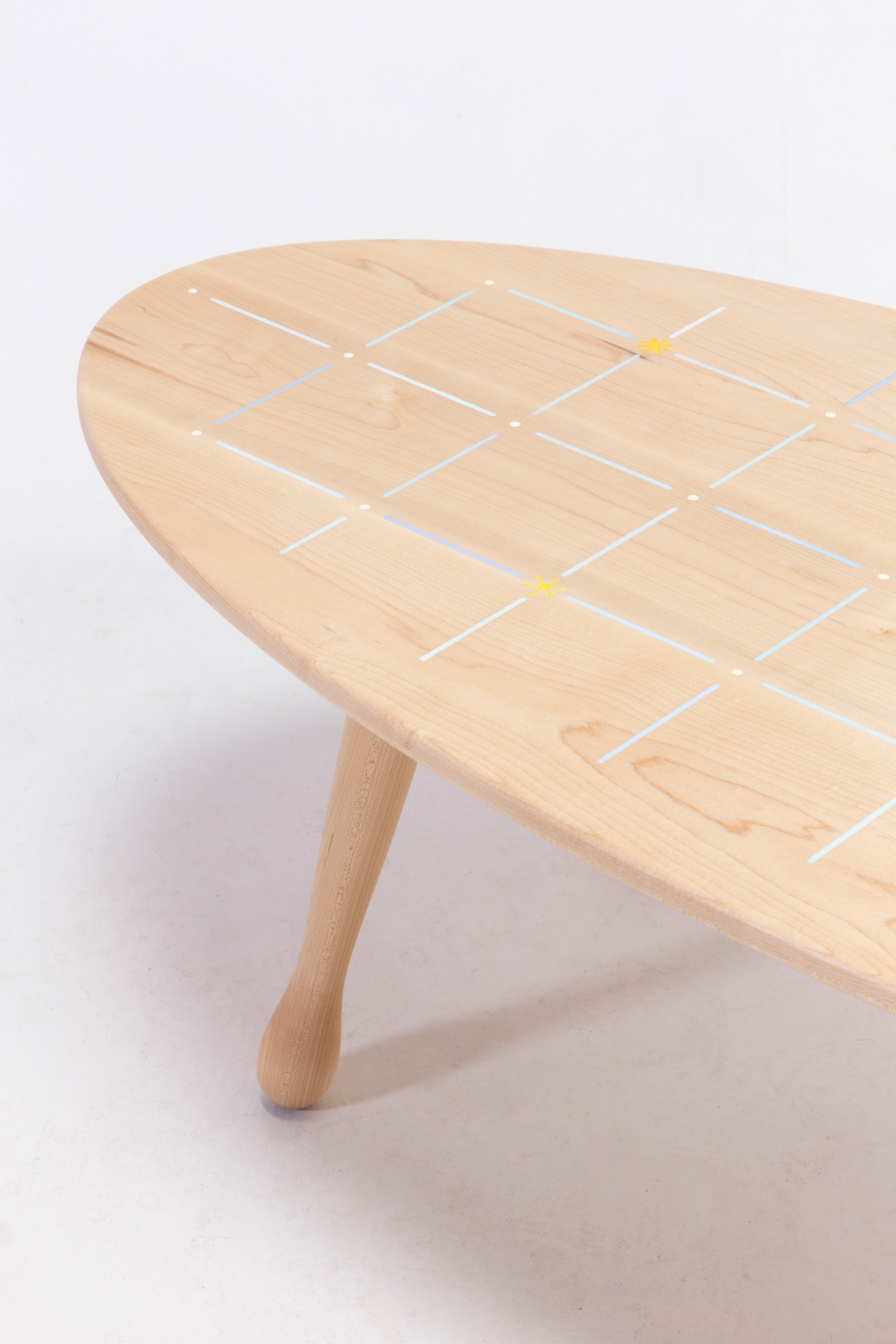 The surface pattern was designed digitally and cut out on a CNC machine. The recessions were painted in by hand and filled with epoxy to create a smooth, flat table top.